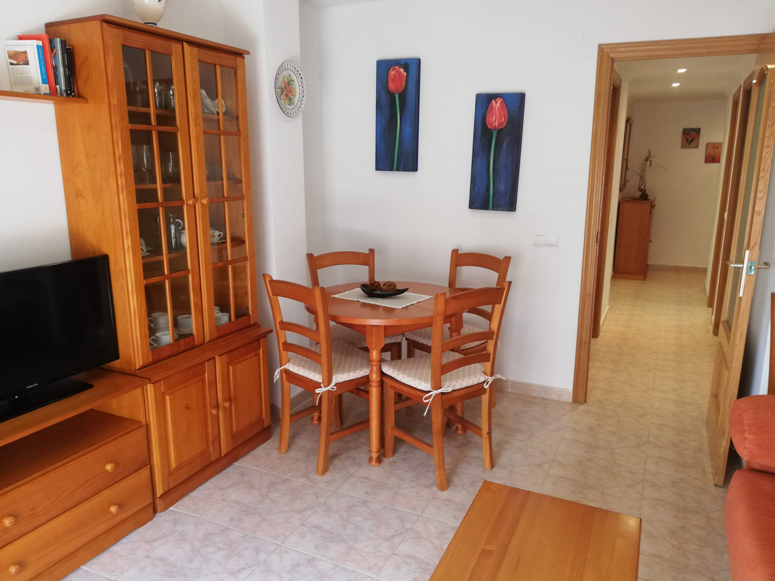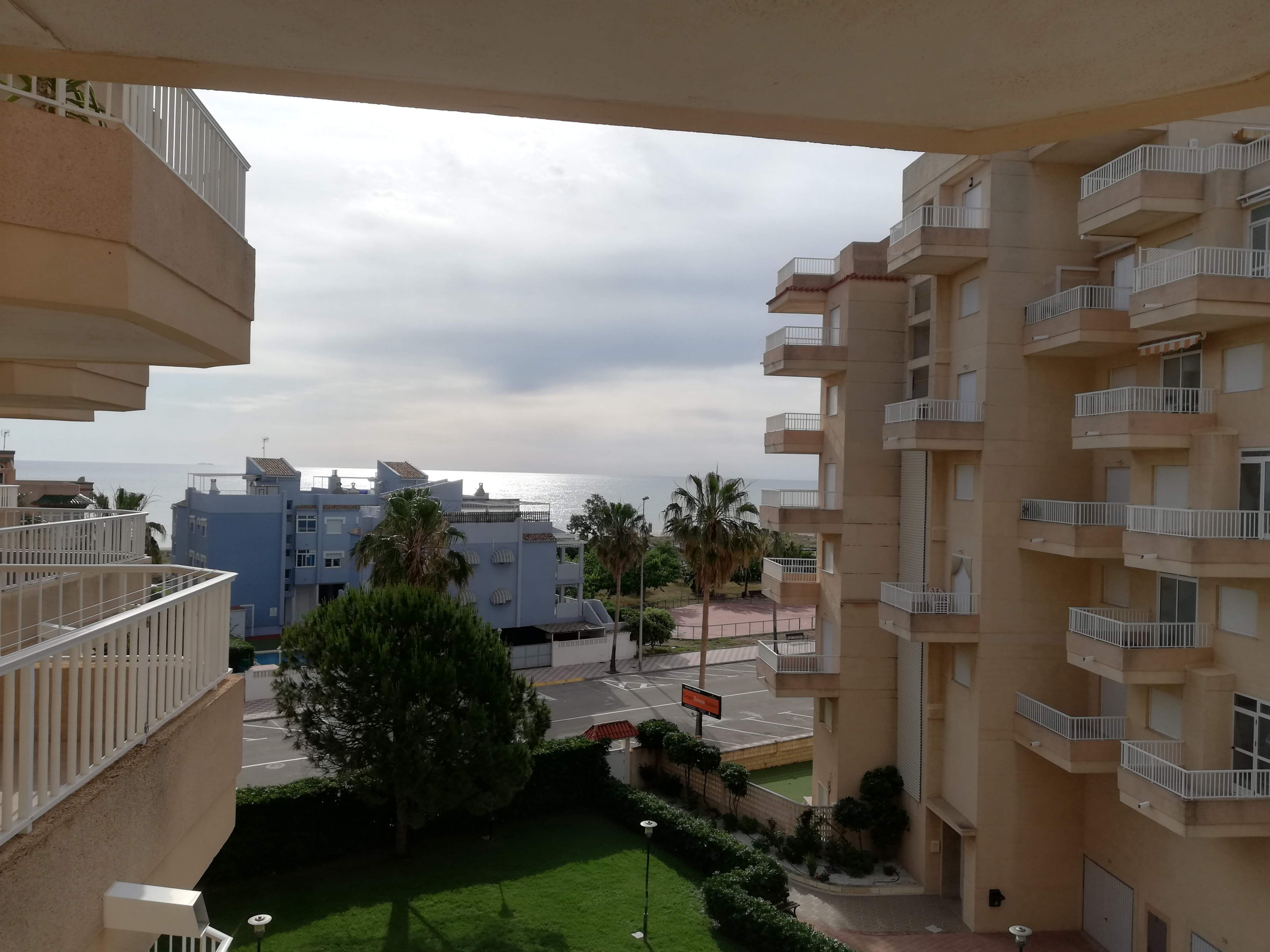 Apartamento con dos dormitorios, un baño, un aseo-ducha, cocina independiente con galería-lavadero y salón comedor con salida a amplia terraza de orientación Sur (con toldo) con vistas limitadas al mar, y buenas vistas a la piscina y a la montaña. Incluye plaza de garaje y servicio WIFI.