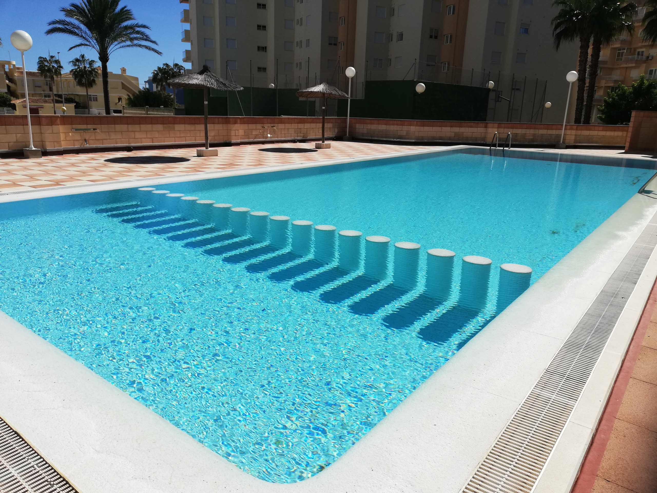 El complejo « MAR AZUL » consta de un bloque de siete alturas con ascensor, ofrece una zona común ajardinada, club y local social, pista de Squash, pista de tenis y zona empisada rodeando la piscina y el charco infantil.