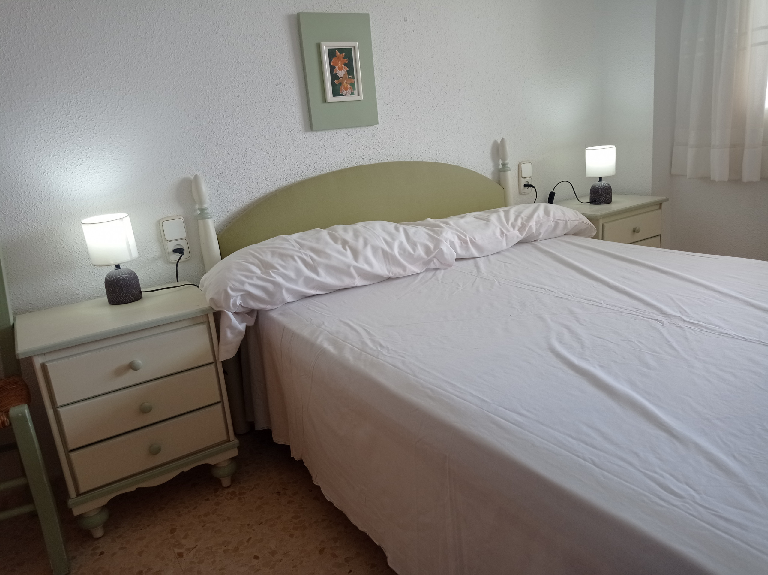 Bonito y espacioso apartamento con tres dormitorios, un baño (con bañera), un aseo-ducha, y cocina independiente con acceso por unas escaleras exteriores a una amplia terraza superior. Cómodo salón con salida a una bonita y recogida terraza de orientación Este frontal con toldo desde donde disfrutar de vistas al mar, a la piscina y a la zonas comunes ajardinadas. Equipado con ventiladores de techo en todos los dormitorios, tiene servicio WIFI e incluye plaza de garaje.