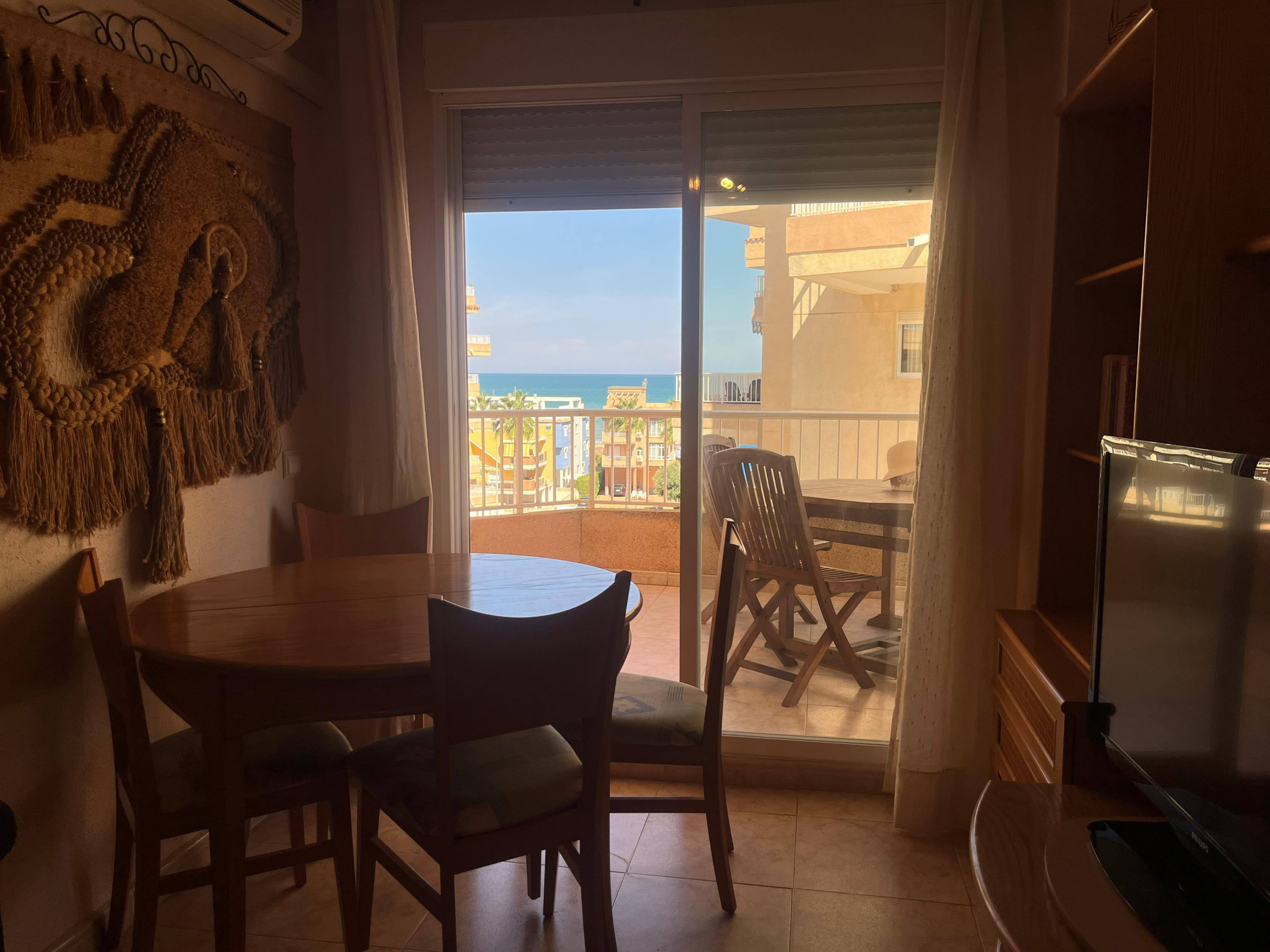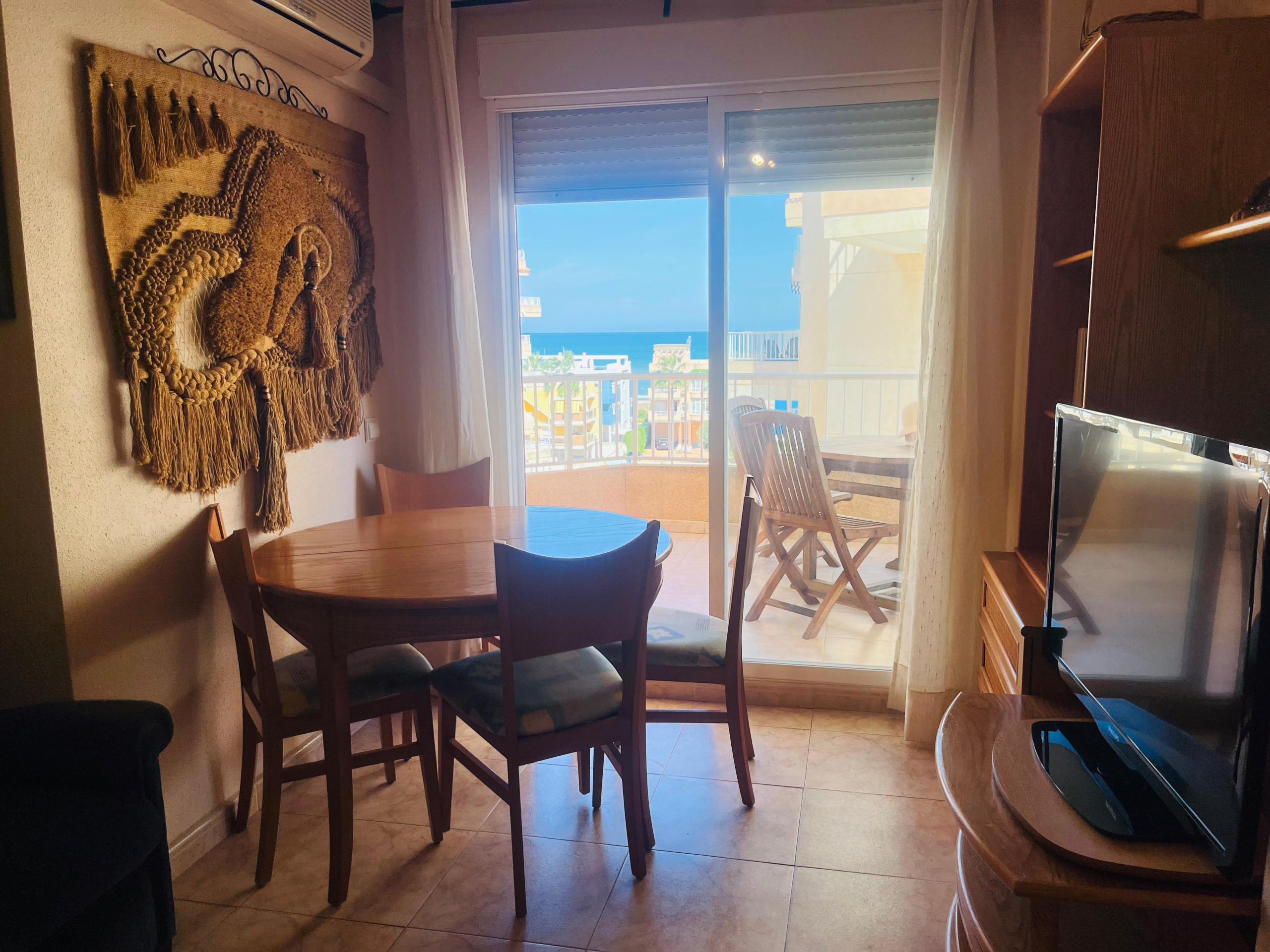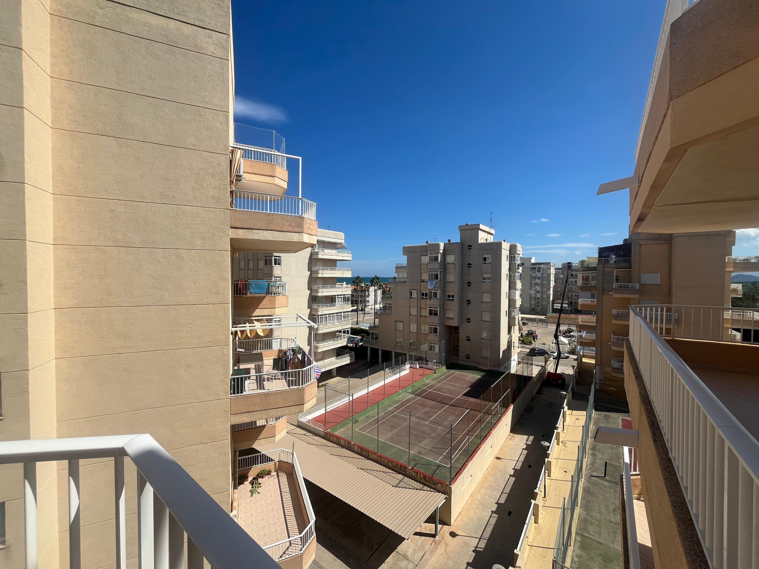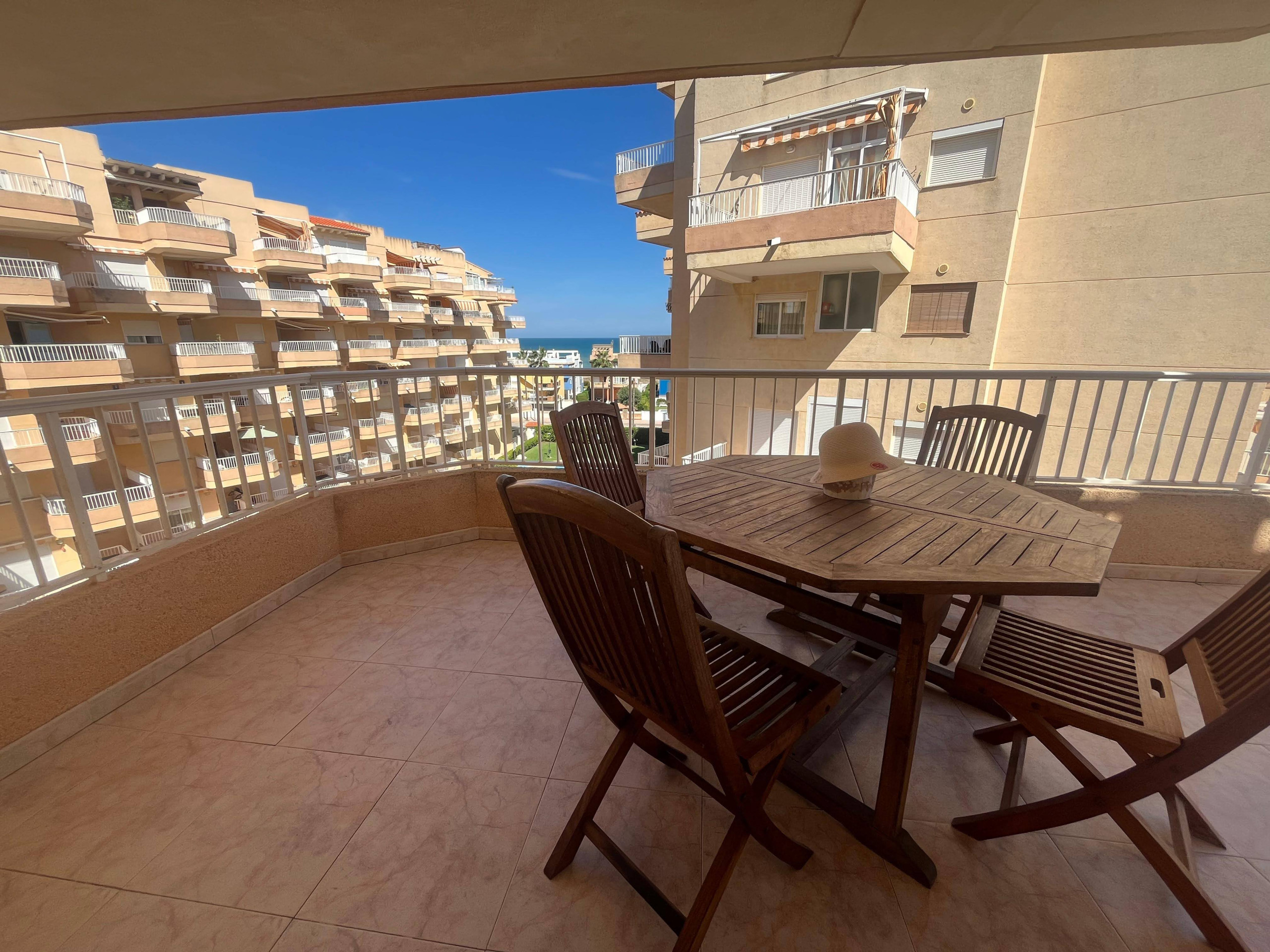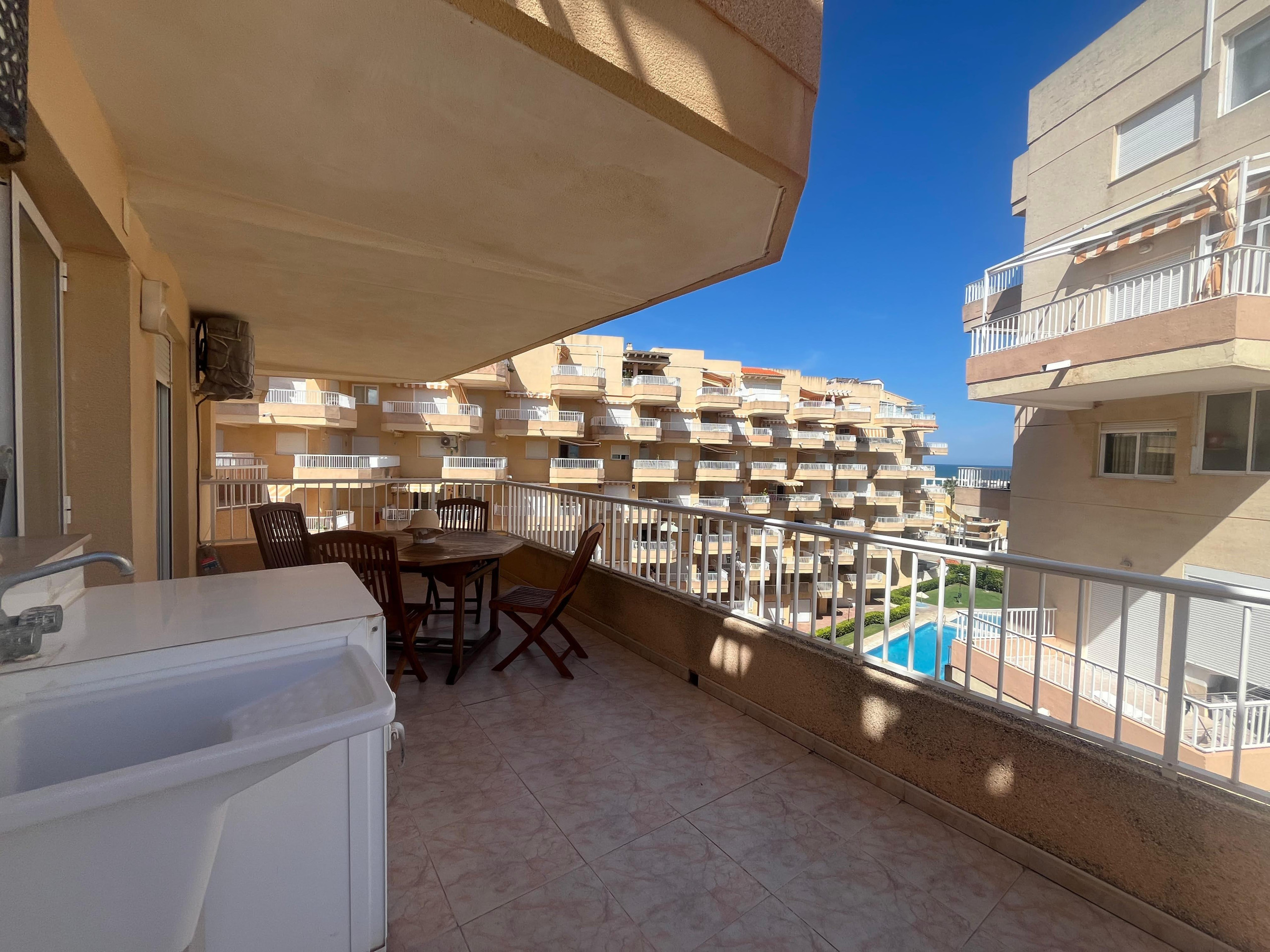 Apartamento con dos dormitorios, dos baños (uno con plato de ducha), cocina independiente y salón comedor, ambos con salida a una amplia terraza de orientación Este con vistas al mar y a la piscina. Ofrece aire acondicionado en el salón-comedor. Incluye plaza de aparcamiento y servicio WIFI..