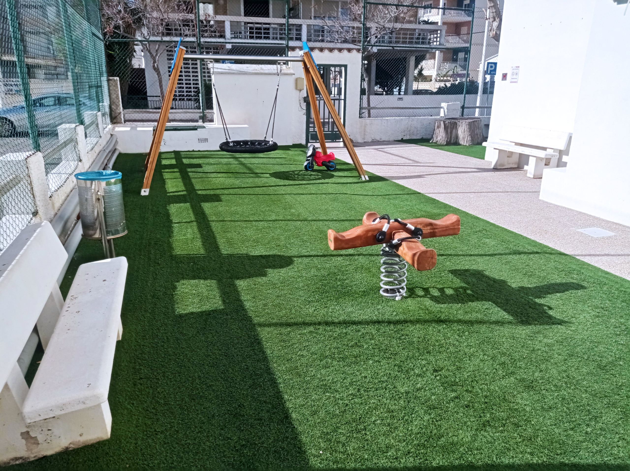 Das Gebäude verfügt über einen Gemeinschaftspool mit abgegrenztem Kinderbecken, Gemeinschaftsbereiche mit kleinem Park mit Schaukel und Tennisplatz.
