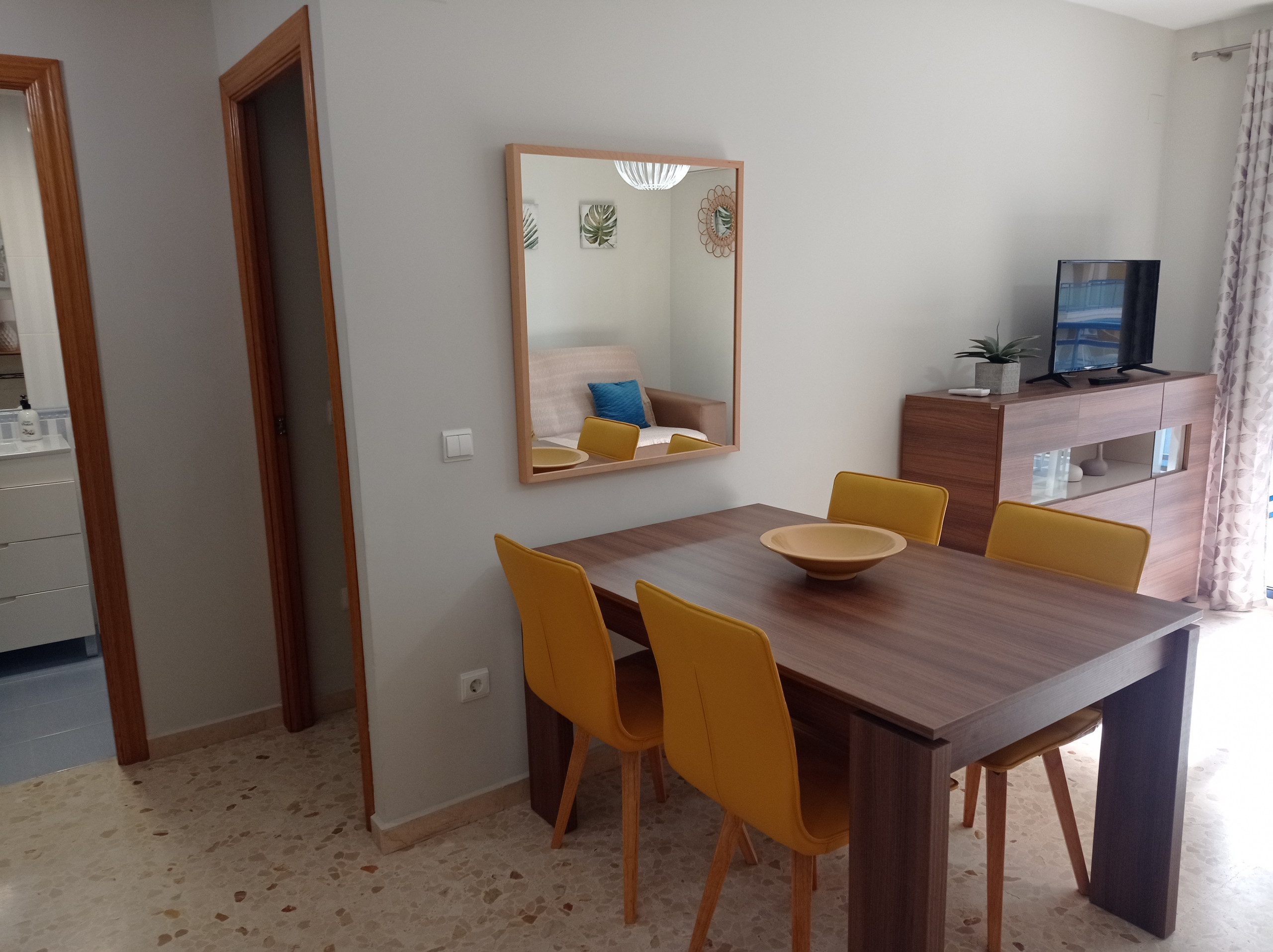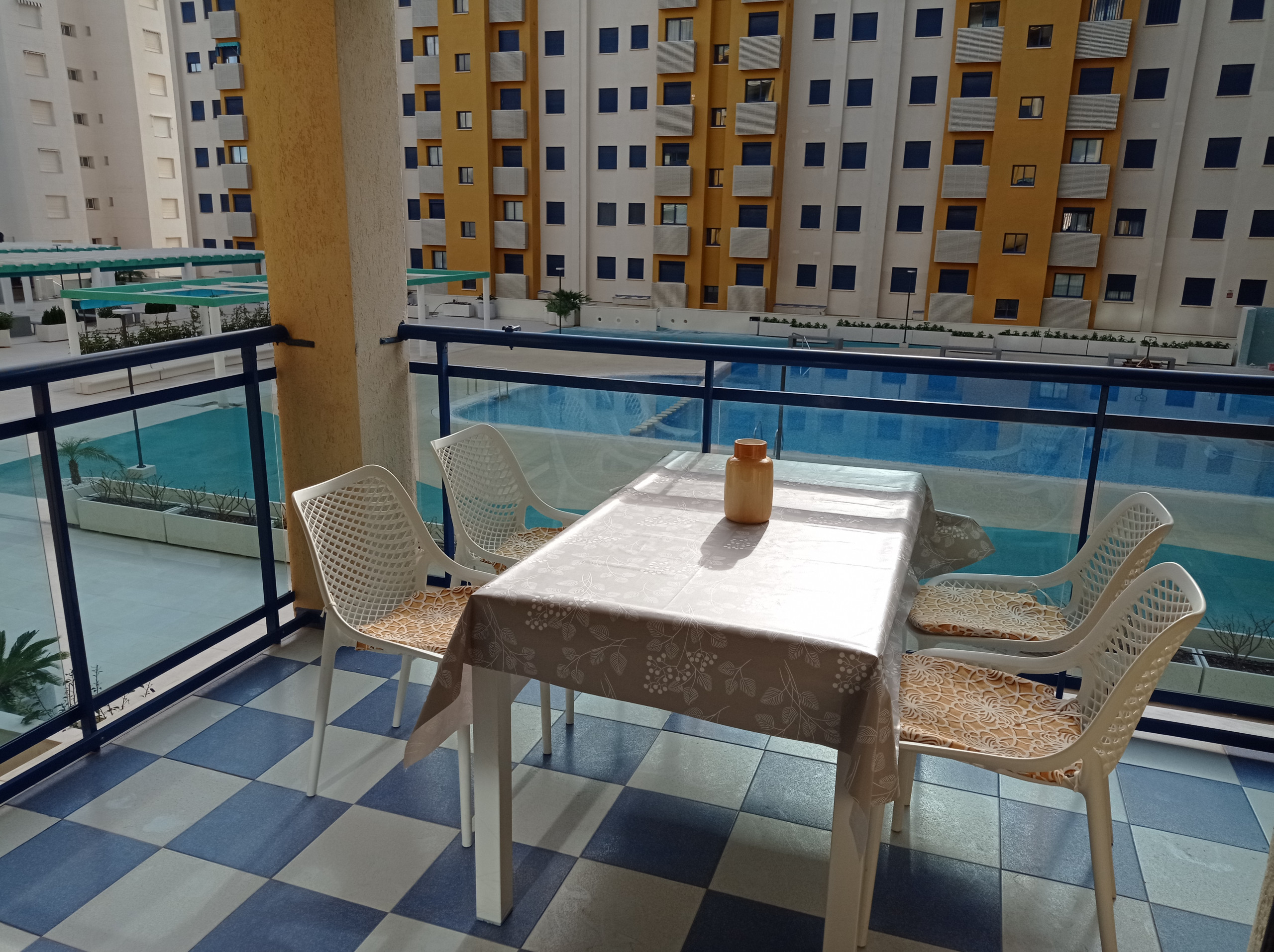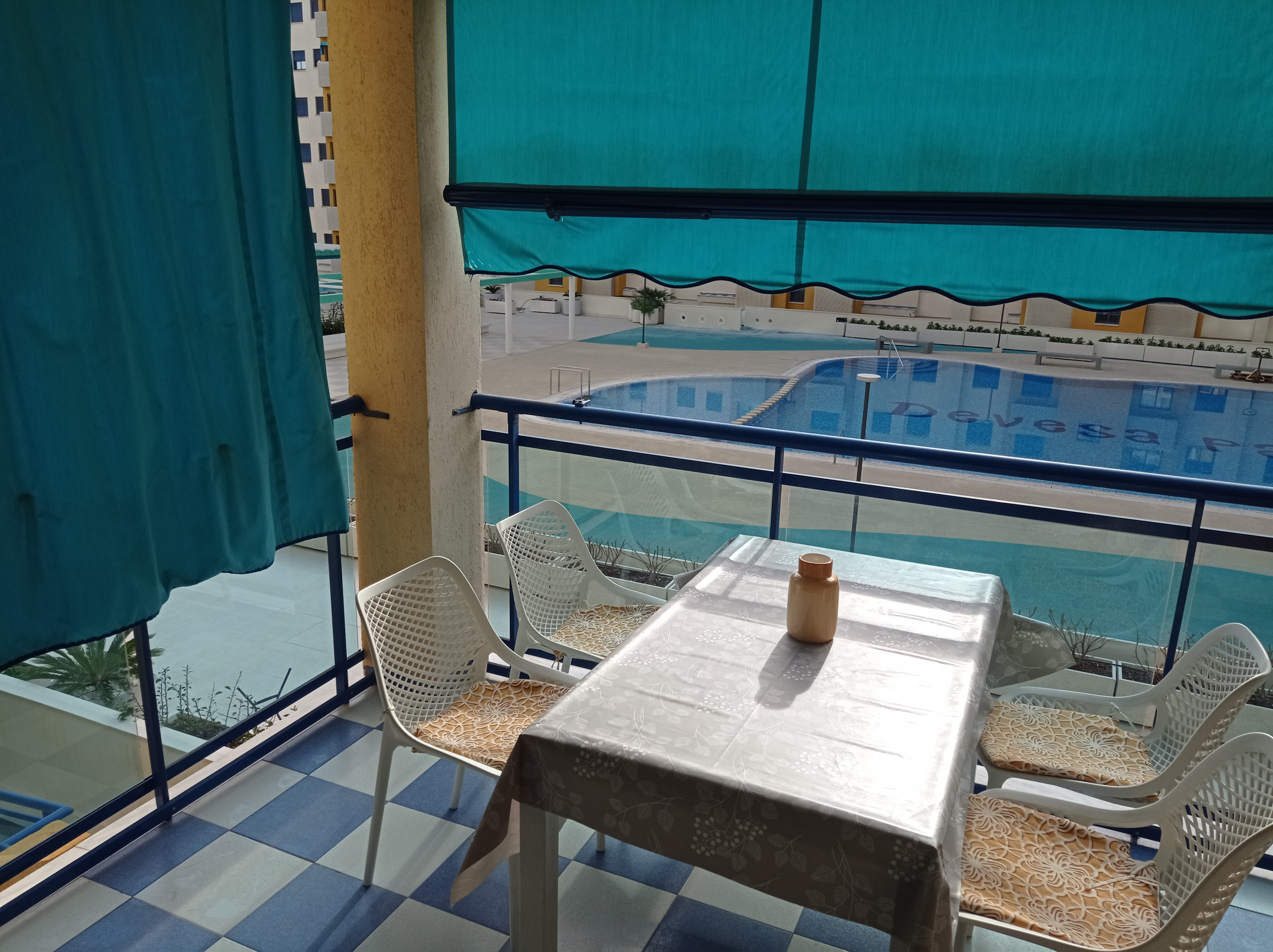 Schöne und gemütliche Wohnung mit zwei Doppelschlafzimmern, einem vollständigen Badezimmer und einer Toilette. Moderne und praktische Möbel, die einen komfortablen und angenehmen Urlaub garantieren. Wohnung mit Südost-Nordwest-Ausrichtung, vollständig außen mit Ausnahme der Badezimmer, mit Klimaanlage im Wohn-Esszimmer. Helle und geräumige Küche, ausgestattet mit Geschirrspüler. Gemütliches Wohn-Esszimmer, von wo aus man auf eine große möblierte Terrasse mit Markise und Markisen-Vorhang gelangt, mit fabelhaftem Blick auf die Gemeinschaftsbereiche und den Pool. Beinhaltet Garagenplatz, ausgestattet mit WLAN-Service und Geschirrspüler. HAUSTIERE NICHT ERLAUBT.