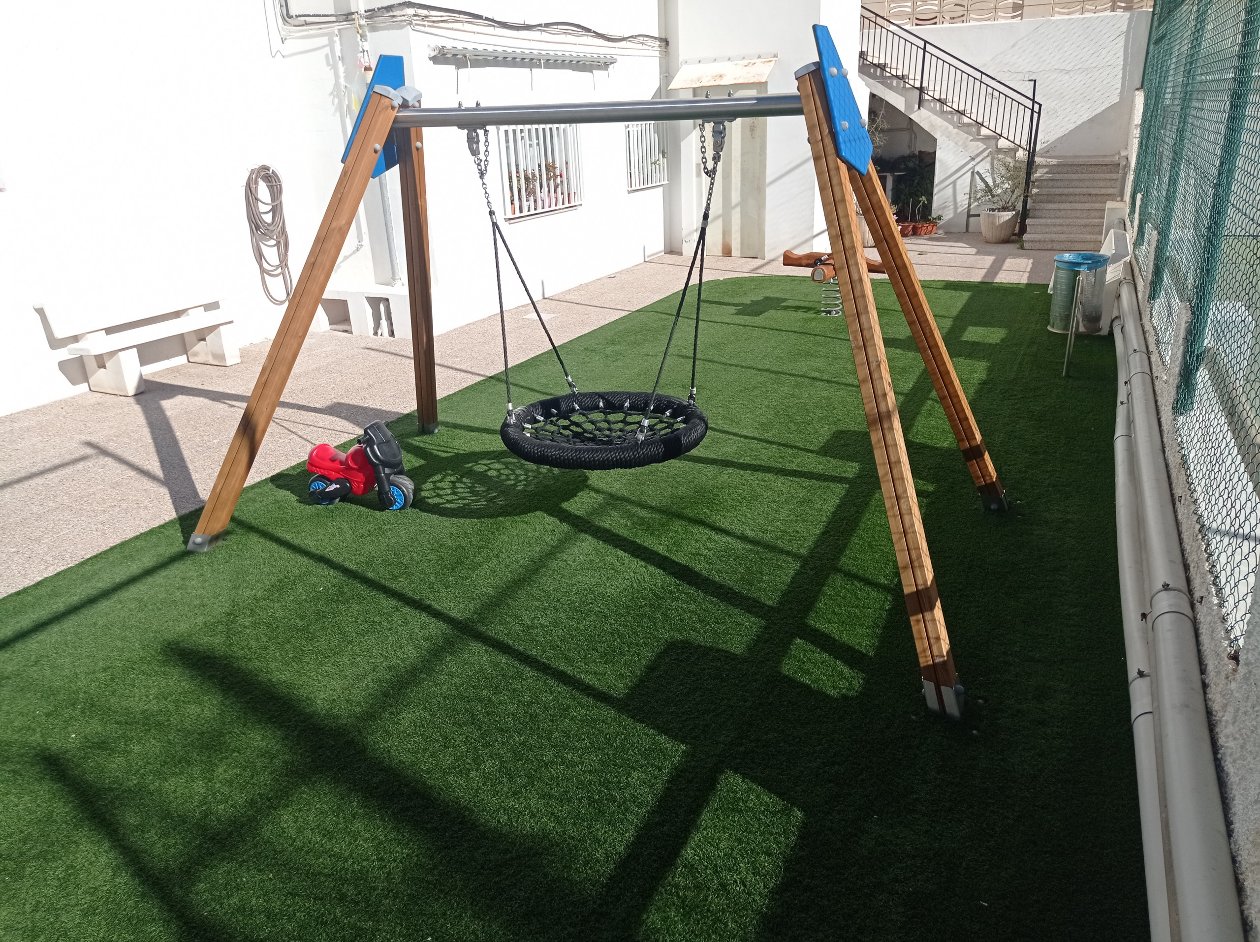 The building has a communal swimming pool with a cordoned children's pool, common areas with a small park with swings, and a tennis court.