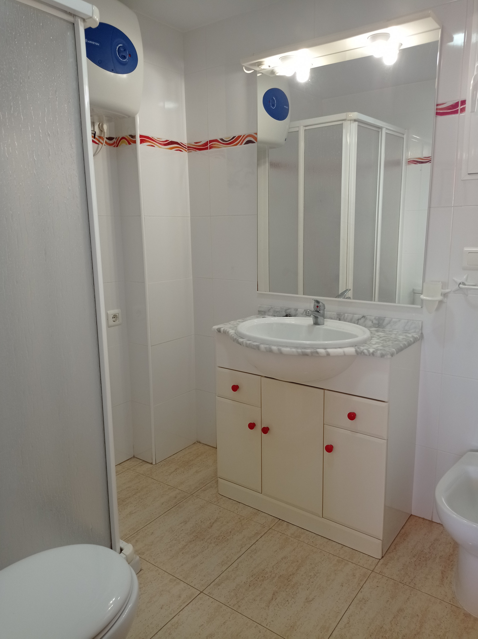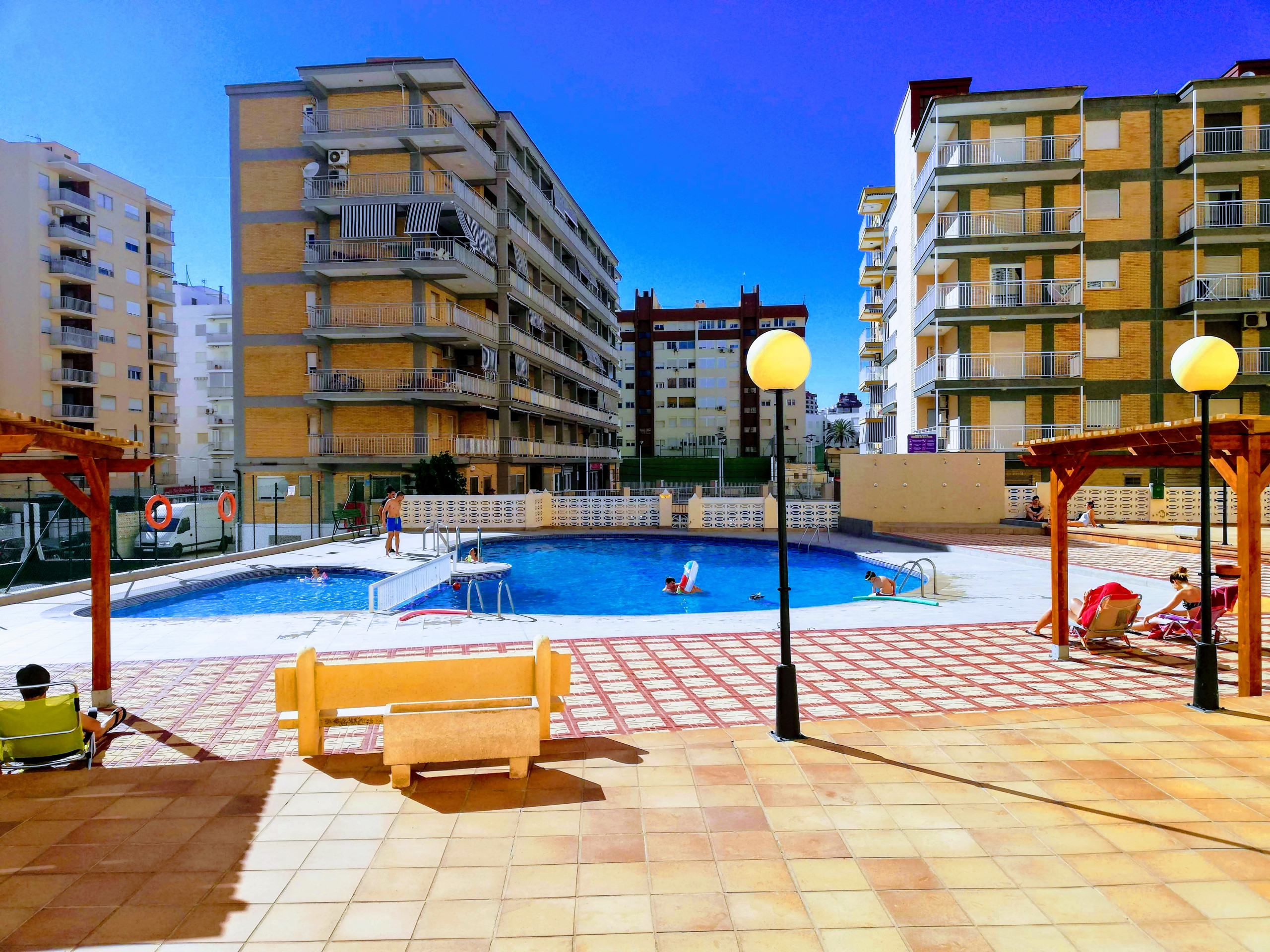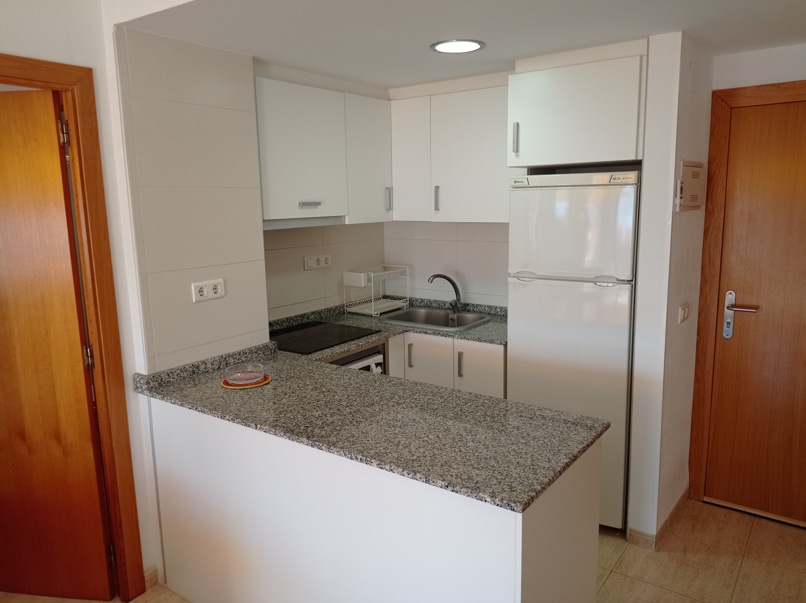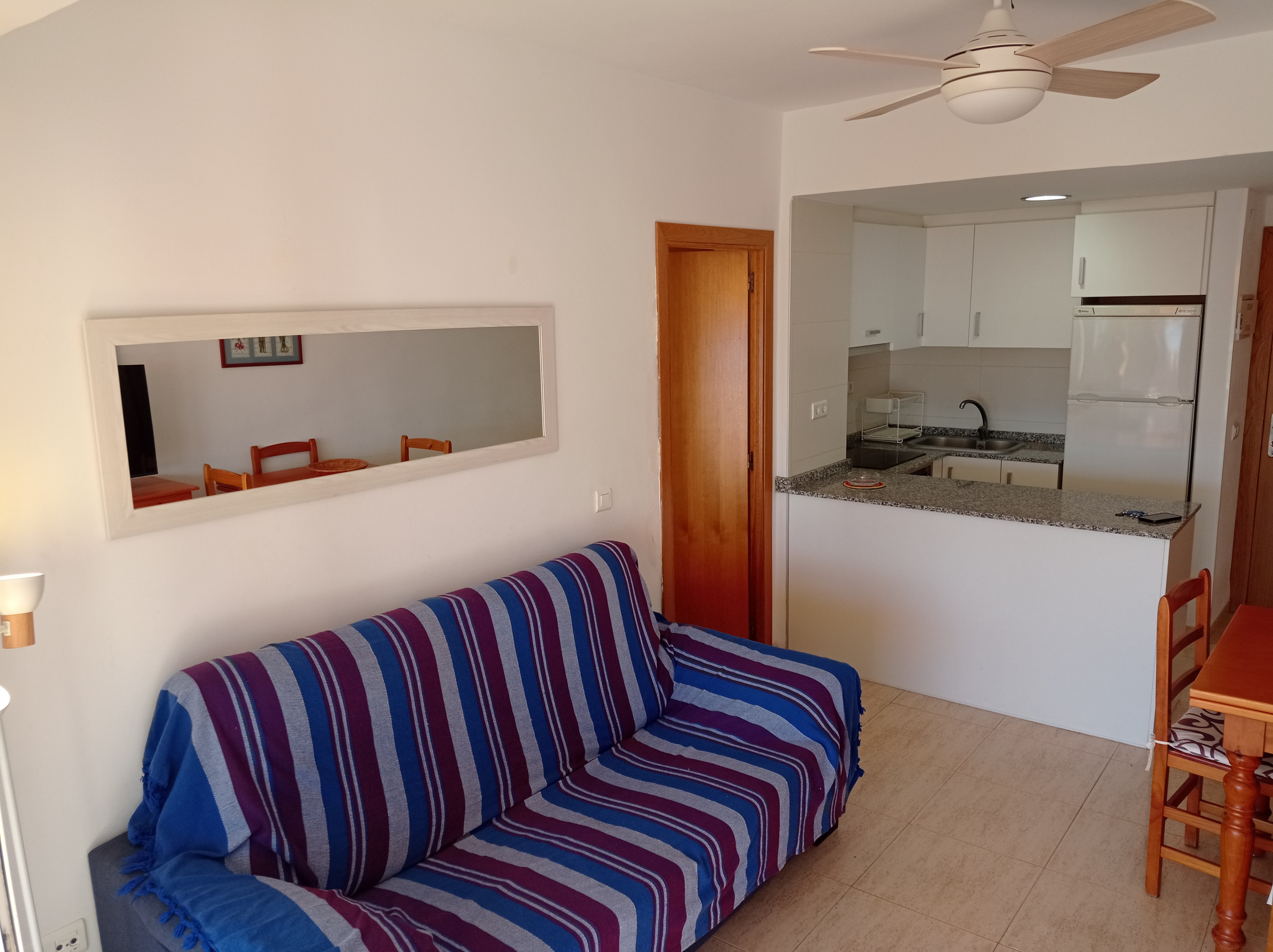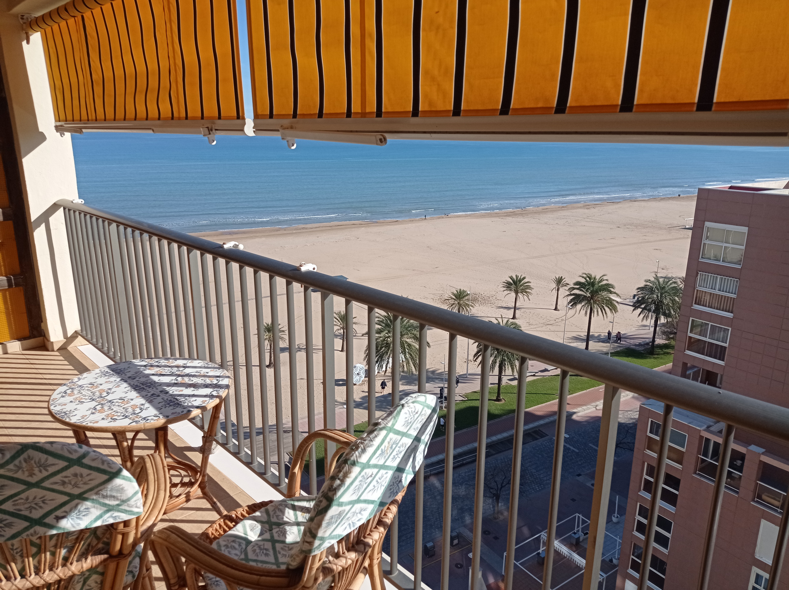 Cosy studio apartment on the first line of Gandia Beach, located on the 10th floor with fabulous views of the sea and the beach. South-facing apartment, as well as the terrace with awnings. Modern and practical furniture for a comfortable holiday. It has a double bedroom (two single beds) with a built-in wardrobe, a bathroom with a shower tray, a practical kitchen with an American bar to the living-dining room, which is equipped with a sofa bed (120 cm wide). Ideal for families with small children!