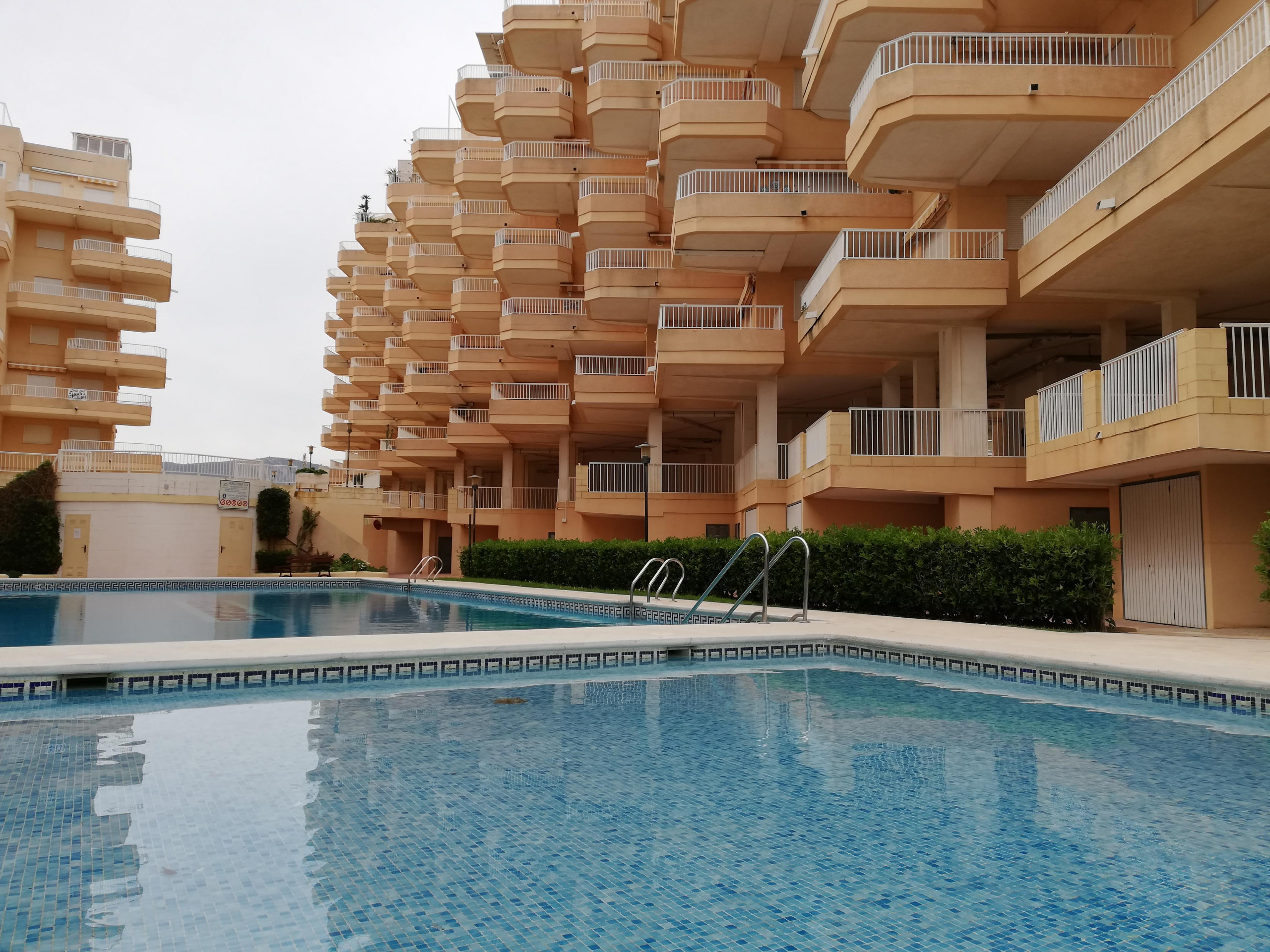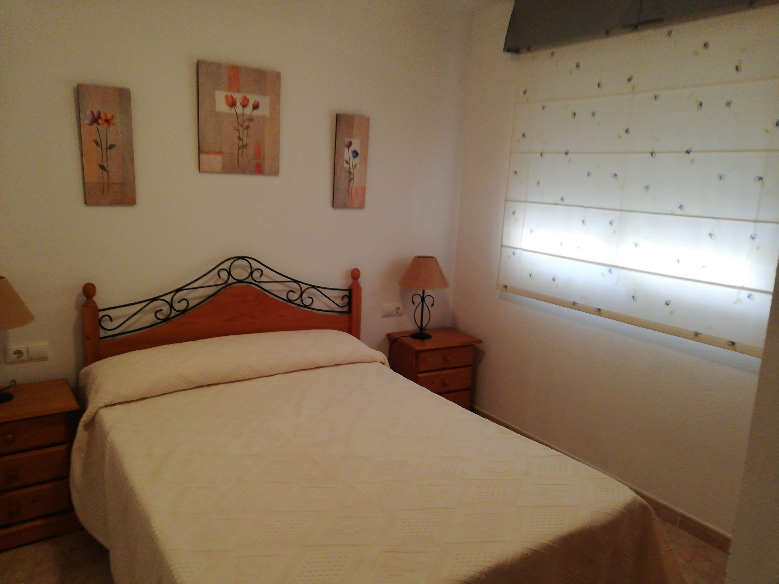 Apartamento con dos dormitorios, un baño, un aseo-ducha, cocina independiente con galería-lavadero y salón comedor con salida a amplia terraza de orientación Sur (con toldo) con vistas limitadas al mar, y buenas vistas a la piscina y a la montaña. Incluye plaza de garaje y servicio WIFI.