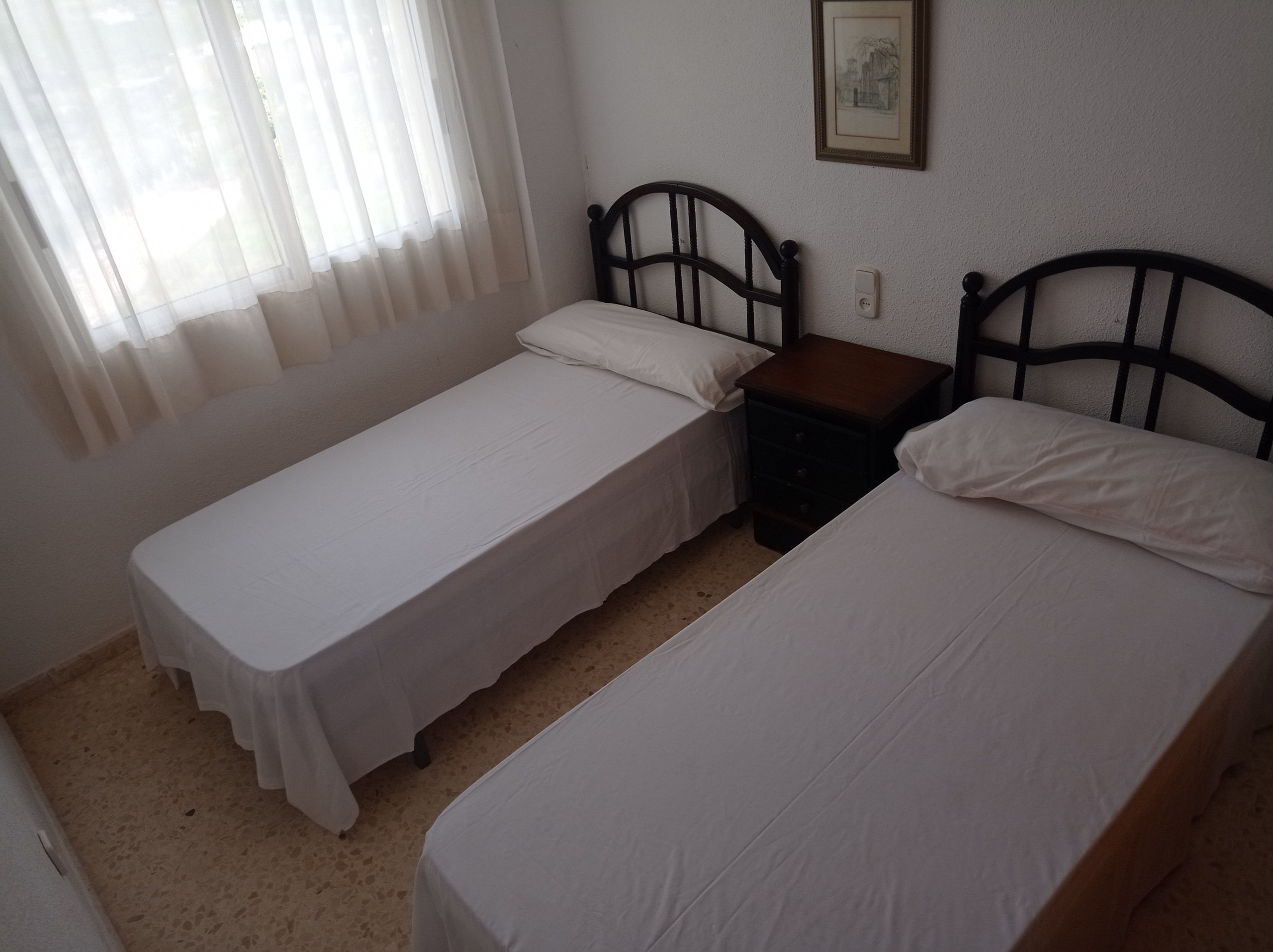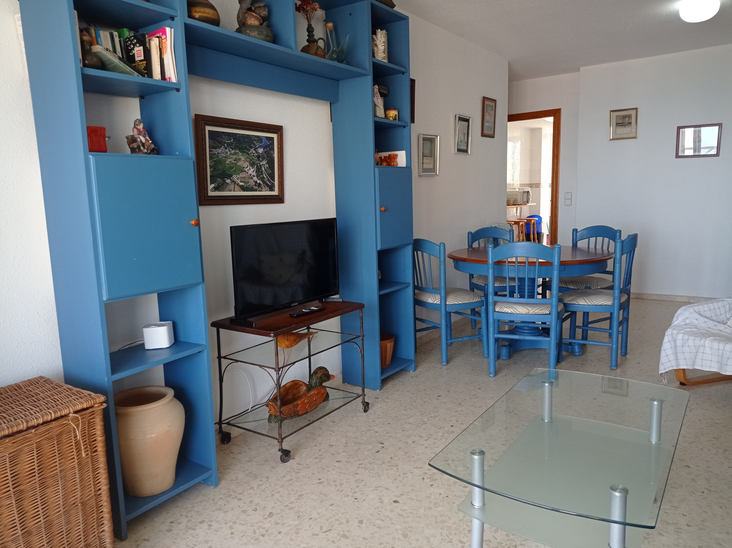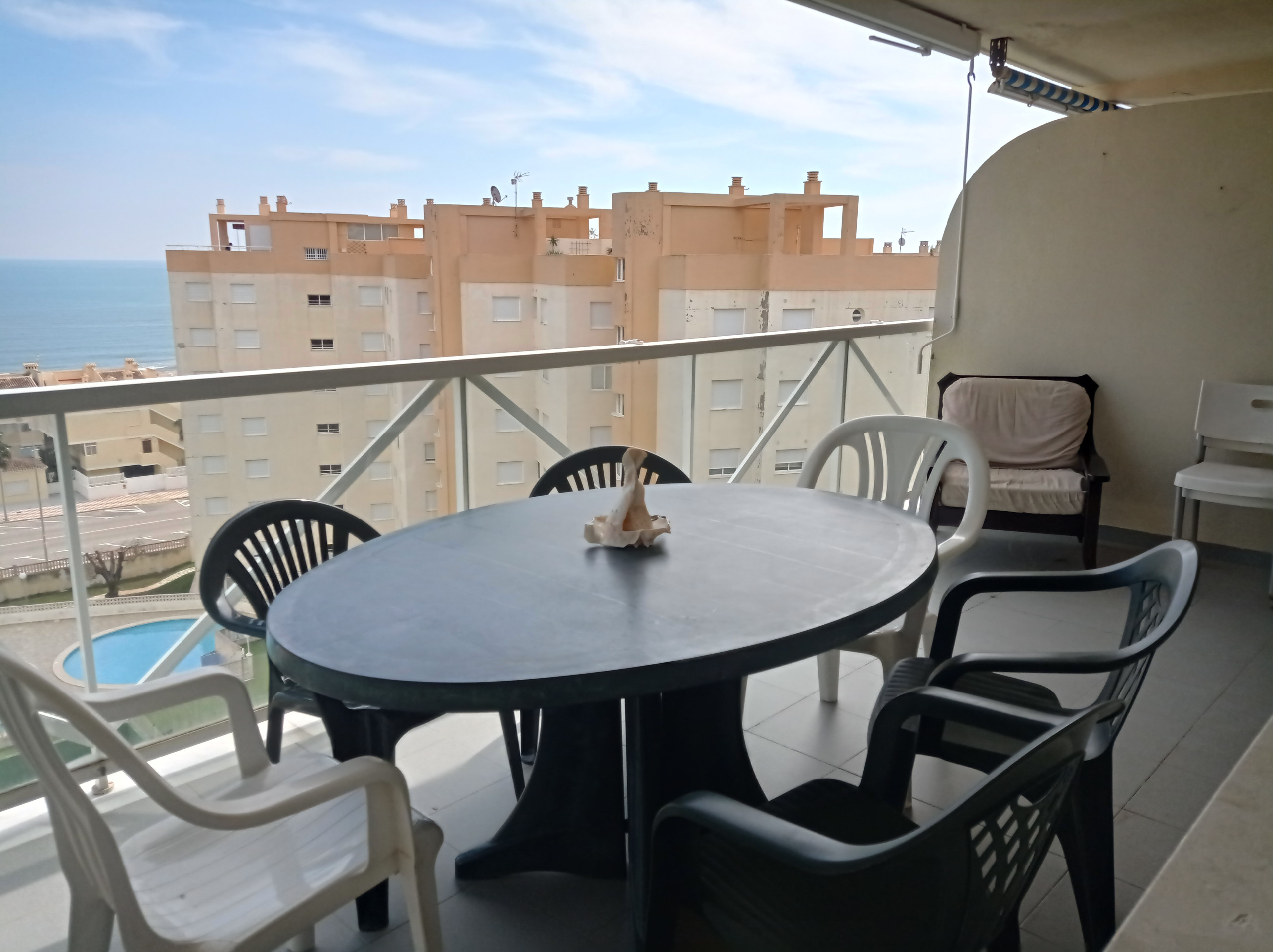 Bel et spacieux appartement avec trois chambres, une salle de bain (avec baignoire), un toilette-douche, et une cuisine indépendante avec accès par un escalier extérieur à une grande terrasse supérieure. Salon confortable avec sortie sur une belle et intimiste terrasse d'orientation Est frontale avec auvent, d'où l'on peut profiter de la vue sur la mer, la piscine et les zones communes paysagères. Équipé de ventilateurs de plafond dans toutes les chambres, il dispose du service WIFI et comprend une place de parking.