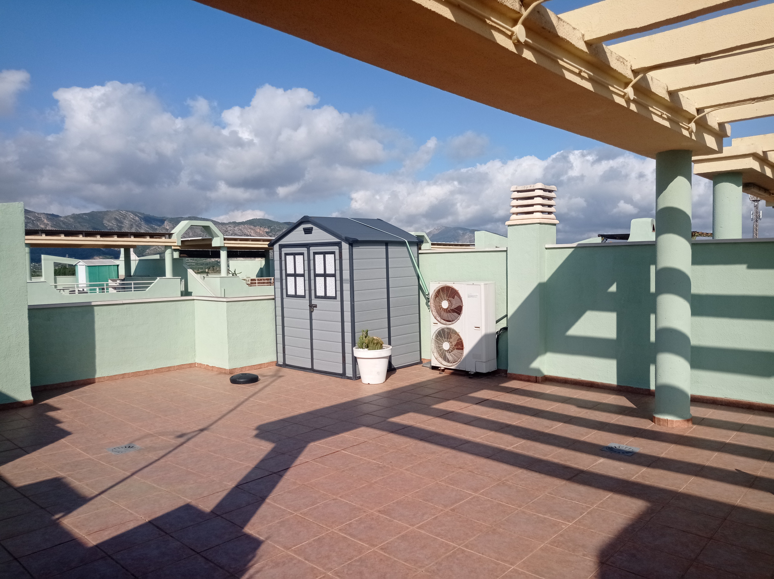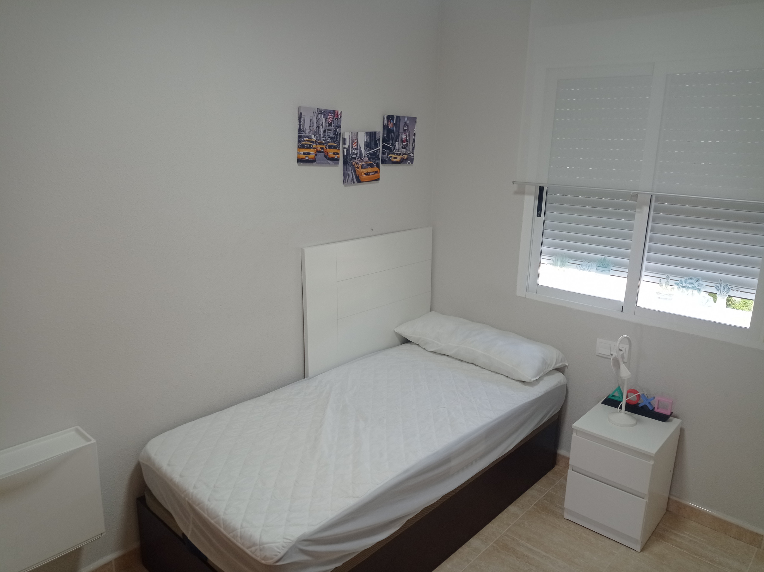 Den har tre sovrum, ett svitbadrum, ett toalett med dusch i korridoren och ett praktiskt kök med tvättstuga med utgång till en andra terrass på västlig riktning med utsikt över poolen och de gemensamma ytorna. Ett mysigt och rymligt vardagsrum-matrum, med tillgång till en stor terrass med östlig riktning och utsikt över de mänskliga rättigheternas trädgångspromenad. Härifrån når man takterrassen.