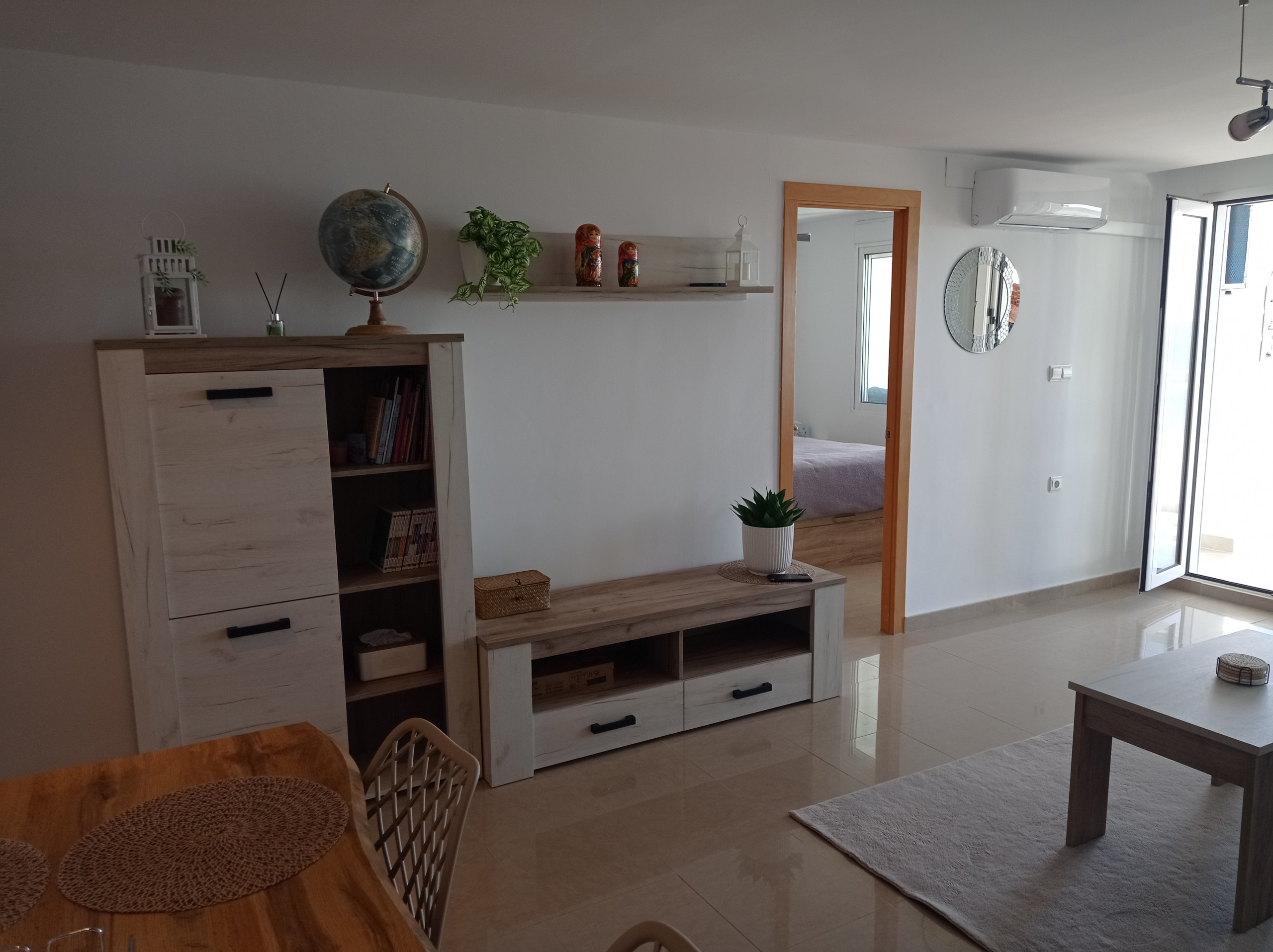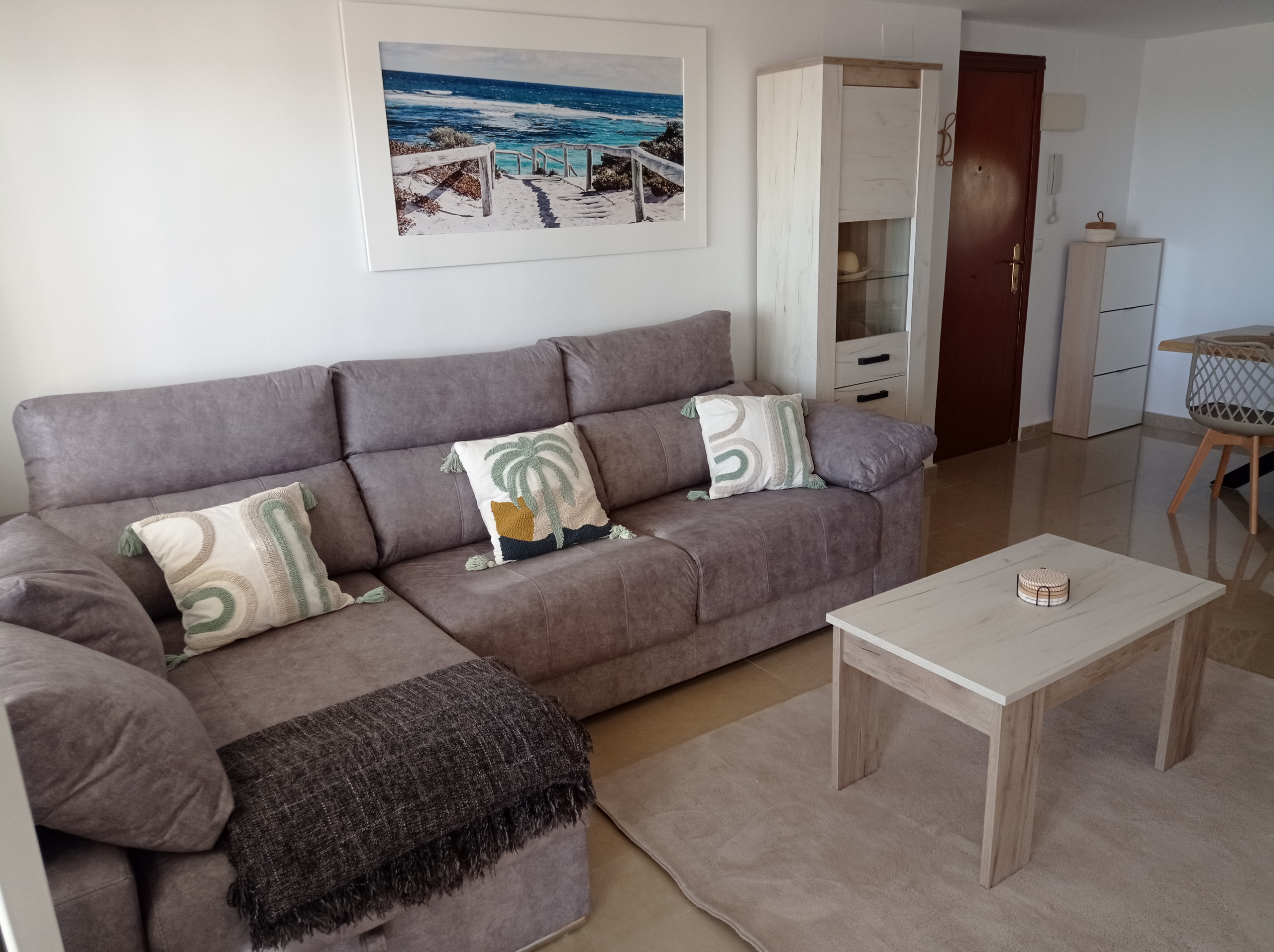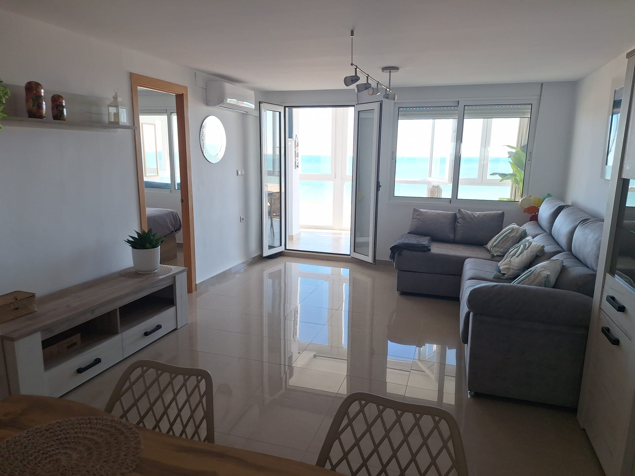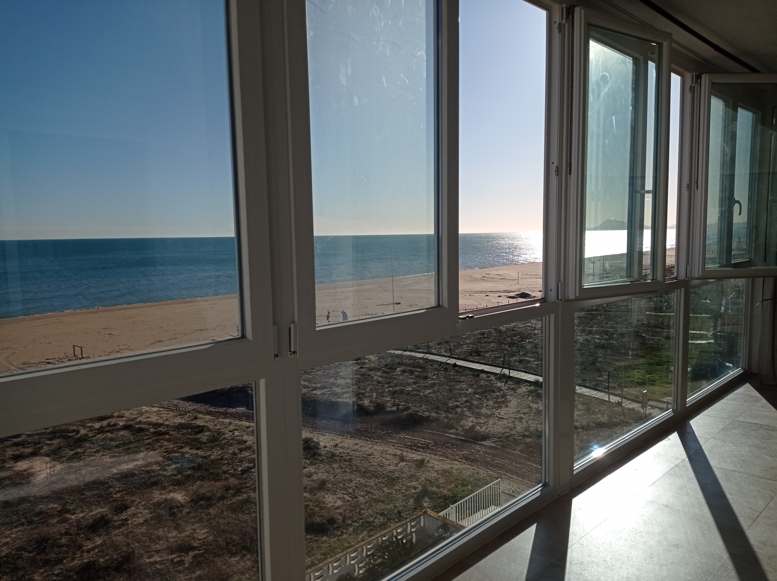 Fantastisk lägenhet på fjärde våningen, med tre dubbelrum, ett badrum med duschplatta, ett toalett, separat kök och rymlig vardagsrum-matsal med utgång till en inglasad terrass med östlig orientering, front mot havet med fantastisk havsutsikt. Nyligen renoverad, allt nytt och oanvänt! Den har luftkonditionering i vardagsrummet, samt takfläktar i de huvudsakliga sovrummen och i vardagsrum-matsalen.
